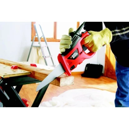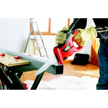 Die Black+Decker Elektro-Handsäge 400 W KS880EC ermöglicht es einfach, sicher und zeitsparend zu Sägen. Ob Zaunpfähle, Rohre, Bodendielen oder Arbeitsplatten, die Sägeblätter werden werkzeuglos durch Knopfdruck schnell und einfach gewechselt. Mit dem stufenlos regelbaren Elektronikschalter ist eine optimale Anpassung an das zu sägende Material möglich. Das Gerät muss nicht mehr am Material angesetzt werden, es kann darin frei eintauchen. Die optimale Ergonomie des Gerätes ermöglicht es so, komfortable und effektiv zu sägen. Das Gebläse hält dabei den Anriss sauber.