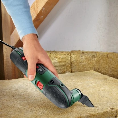 Die Bosch Constant-Electronic sorgt auch bei starker Belastung für eine gleichbleibend hohe Leistung des Multifunktionswerkzeuges. Dank der stufenlosen Schwingzahlvorwahl kann jede Arbeit optimal an Material und Anwendung angepasst werden und komfortabel durchgeführt werden. Die abgerundeten Schnittkanten der Tauchsägeblätter mit Curved-Tec sorgen für präzises Eintauchen und Arbeiten. Der vierstufige Tiefenanschlag ermöglicht zudem das Einhalten der exakten Schnitttiefe. Das Multitool liegt dank seines geringen Gewichts von 1,1 kg gut in der Hand und kann bei Bedarf mit einem zusätzlichen Handgriff (separat erhältlich) ausgestattet werden.