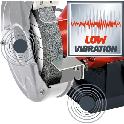 Das Gehäuse des Schleifers ist in robuster, schwerer Metallkompaktbauweise gefertigt und steht fest und sicher auf 4 vibrationsdämpfenden Gummifüßen. Das Gerät verfügt über verstellbare Arbeitsauflagen, die sich mühelos an die jeweilige Schleifanwendung anpassen lassen. Für Sicherheit beim Schleifen sorgen die einstellbaren Funkenschutzgläser sowie die seitlich geschlossenen Schutzhauben.