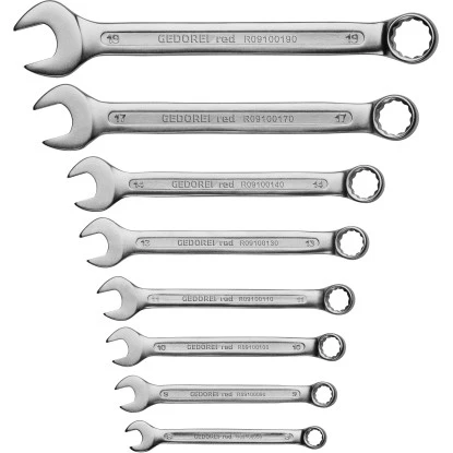 Der 8-teilige Schlüsselsatz beinhaltet die Schlüsselgrößen 8 mm, 9 mm, 10 mm, 11 mm, 13 m, 14 mm, 17 mm und 19 mm in einem praktischen Halter zur leichteren Aufbewahrung. Ein Qualitätsprodukt made by Gedore.