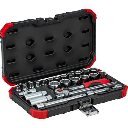 Das 26-teilige Gedore Steckschlüssel-Set R59003026 ist nach DIN gefertigt. Das gesammte Set hat einen 10 mm (3/8″) Innenvierkant-Antrieb. Das Set wird in einem praktischen Koffer mit Metallscharnieren und Verschlüssen mit klemmgesicherten Werkzeugen geliefert. Die Beschriftung im Koffer ermöglicht ein rasches Finden der passenden Einsätze oder Bits. Die Umschaltknarre hat einen Rechts-/Linkslauf mit Hebelumschaltung und ist feinverzahnt mit 72 Zähnen und einem Rückschwenkwinkel von 5°. Die insgesamt 18 metrischen Sechskant-Steckschlüsseleinsätze haben Schlüsselweiten von 6 mm – 24 mm. Zusätzlich ist eine Verlängerung von 15 cm, ein Reduzierstück von 10 mm (3/8″) auf 6,3 mm (1/4″), ein Kardangelenk und ein Quergriff mit Gleitstück beigelegt. Die Oberfläche ist matt und glänzend verchromt. Ein Qualitätsprodukt made by Gedore.
