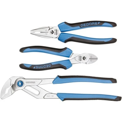 Das 3-teilige Gedore Zangen-Set S8303 JC enthält eine Kraft-Kombinationszange 8250-180 JC, einen Kraft-Seitenschneider 8316-160 JC und eine 15-fach verstellbare Wasserpumpenzange 142 10 JC (25 cm). Das Zangen-Set wird im Gedore Werk in Österreich hergestellt. Alle Zangen sind nach der jeweils gültigen DIN gefertigt. Die BCP-Kennzeichung auf der Schneide (Best cutting Power) zeigt sie die optimale Schnittstelle mit der perfekten Kraftausnutzung an und sorgt damit für ein 35 %-iges Kraftersparnis bei dem Kraft-Seitenschneider und der Kraft-Kombinationszange.