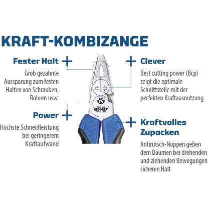 Die Kraft-Kombinationszange hat eine Härte von 62 HRC- 64 HRC und eine maximale Schnittleistung von 3,6 mm Draht (weich). Der Kraft-Seitenscheider hat eine Härte von 63 HRC – 65 HRC und eine maximale Schnittleistung von 2,4 mm Draht (weich). Beide Gedore Kraft-Zangen bieten höchste Schneidleistung mit den induktiv gehärteten Präzisionsschneiden und das bei geringem Kraftaufwand. Die Kraft-Zangen sind 16 cm bzw. 18 cm lang und bestehen aus Gedore Premium CrV3 plus Stahl.