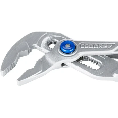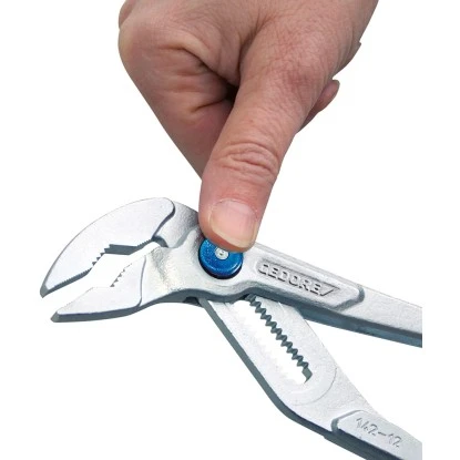 Die Wasserpumpenzange zeichnet sich durch ihren praktischen Druckknopf aus. Damit ist sie 15-fach verstellbar und greift mühelos Rohre bis max. 44 mm (1 3/4″). Die Druckknopfverstellung bietet auch die Möglichkeit der Einhand Bedienung. Der schmale Zangenkopf erreicht problemlos auch schwer zugängliche Stellen. Die versetzten Greifflächen sorgen für einen starken stelbstklemmenden Halt an Muttern und Rohren. Neben runden Formen ist die Greiffläche mit den langen Zangenbacken und den induktiv gehärteten Zähnen auch für viereckige oder sechskantige Flächen geeignet. Die Härte beträgt 61 HRC. Die Zange ist 25 cm lang. Alle drei Zangen haben ergonomische 2-Komponentengriffe mit Antirutsch-Noppen für den sicheren Halt der Zange durch den Daumen. Ein Qualitätsprodukt made by Gedore.