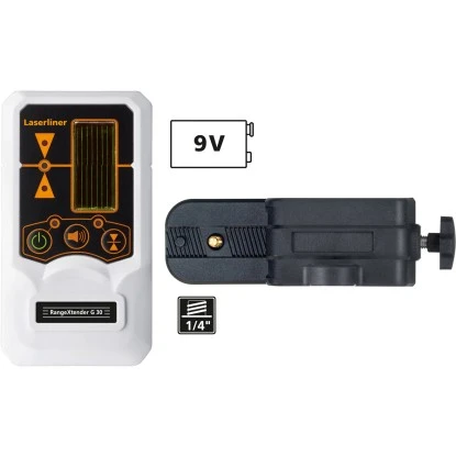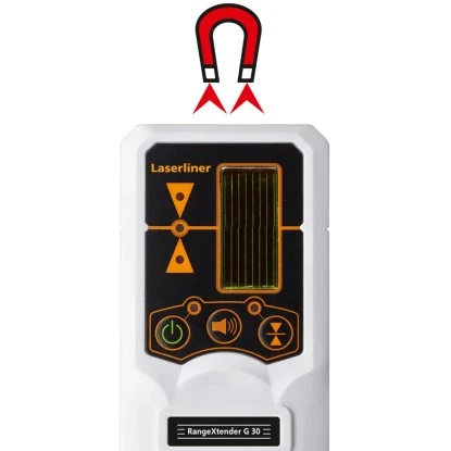 Der Laserliner Handempfänger RangeXtender G30 ist für alle Linienlaser mit GRX-READY Technologie geeignet. Das Gerät erkennt die pulsierenden Laserlinien auf eine Entfernung von bis zu 30 Metern und kann einfach an Messlatten fixiert werden, ideal zum Festlegen von Referenzmaßen. Der integrierte Kopfmagnet ermöglicht die Anbringung an metallischen Oberflächen. Mit den beiden einstellbaren Empfindlichkeitsstufen kann eine optimale Einstellung für den Nah- und Fernbereich gefunden werden.