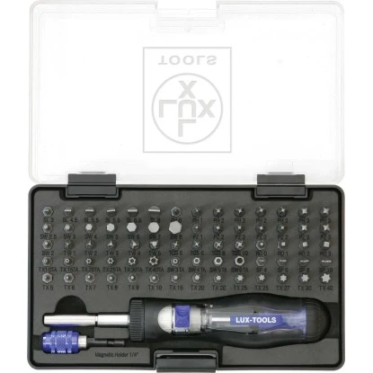 Das 73-teilige LUX-TOOLS Bitset Comfort bietet Ihnen eine umfangreiche Ausstattung für Ihre Heim- und Hobbywerkstatt. Dadurch sind Sie sowohl mit allen gängigen als auch speziellen Schraubprofilen bestens ausgerüstet. Die Bits sind aus hochwertigem Chrom-Vanadium-Stahl gefertigt. Eine geordnete und sichere Aufbewahrung bietet der praktische, robuste Kunststoffkoffer, der sich außerdem leicht transportieren lässt.