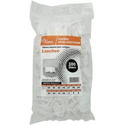 Fliesenlegen war noch nie so einfach. Mit den Laschen von Medial verlegen Sie spielend einfach Ihre Fliesen wie ein Profi. Dank dieser Verlegehilfe lassen sich die Fliesen perfekt und gleichmäßig ausrichten. Zuerst verlegen Sie die erste Fliese wie gewohnt, danach stecken Sie die Lasche unter die Fliese und legen die benachbarte Fliese an. Die Laschen werden danach mit Hilfe der Keile von der Seite gespannt. Dadurch wirkt keine Zugkraft von oben, welche die Laschen herausreißen kann. Nach dem Aushärten des Klebers treten oder schlagen Sie die Laschen und die Keile zusammen in Längsrichtung ab. So schließen Sie in nur wenigen Schritten Ihre Verlegearbeiten ab. Die Laschen sind für Fliesen mit einer Materialstärke von 15 – 20 mm geeignet und benötigen eine Fugenbreite von mindestens 1,6 mm.