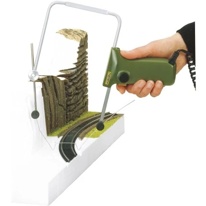 Das Proxxon Heißdraht-Schneidegerät Thermocut 12/E eignet sich zum Freischneiden in dicken Styroporplatten für den Diorama-Modelleisenbahnbau und zum Erstellen beliebiger Profile. Es besitzt einen stabilen Bügel mit schwenkbarem Befestigungselement oben und ausziehbarer unterer Drahtbefestigung.