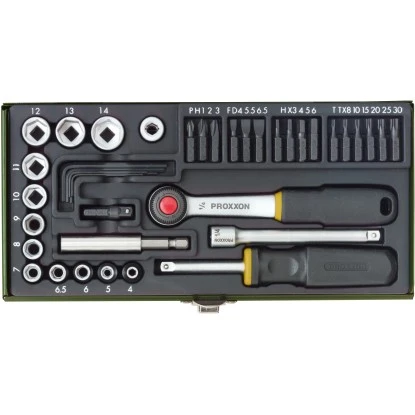 Der Proxxon Schraubersatz 1/4″ wird in einem stabilen, pulverbeschichteten Stahlkasten geliefert.