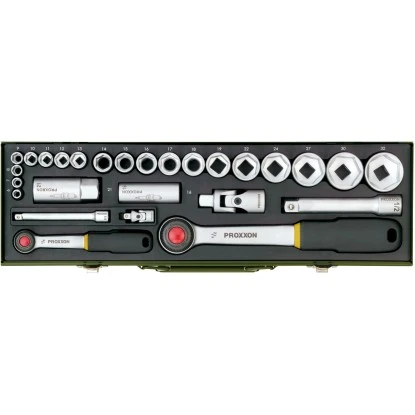 Der Proxxon Steckschlüsselsatz 1/2″ und 1/4″ 27- teilig wird in einem stabilen, pulverbeschichteten Stahlkasten geliefert. Er ist ideal für alle wichtigen PKW-Schrauben von 6 mm – 32 mm.