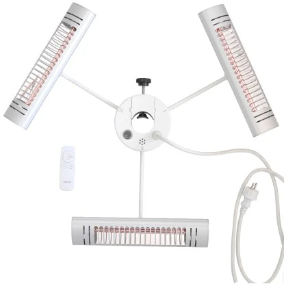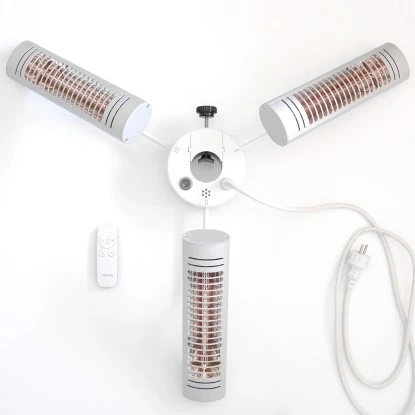 Mit der Umbrella X30 Serie bietet Vasner Heizstrahler zur Montage an Sonnenschirmen jeder Art (mit einem Stangendurchmesser von 20 mm – 55 mm). Die drei Infrarotstrahler sind schon fest an der Halterung angebracht und können einfach und schnell an verschiedenen Stangen montiert werden. Für wohlige Infrarotwärme im 120 – 360 ° Radius um Ihren Sonnenschirm herum sind die einzelnen Schirm Heizstrahler separat an- / ausschaltbar. Dabei sind die besonderen Terrassen-Heizstrahler in den Farben Silber und Schwarz erhältlich, um Ihnen das ideale Modell zur Kombination mit Ihrer bestehenden Einrichtung zu bieten. Zur Montage müssen Sie lediglich die Halterung öffnen, an Ihren Terrassenschirm hängen und ganz einfach per Stellschraube an den Durchmesser der Stange anpassen. Schon können Sie losheizen! Die beiliegende Fernbedienung ermöglicht eine bequeme Bedienung der drei Infrarot-Heizstrahler für insgesamt 3000 Watt Wärme um Ihren Sonnen- oder Gastroschirm herum. Manuell lassen sich die drei Terrassenheizer jeweils um 90 ° (horizontal, vertikal) schwenken, damit Sie zwischen einer breitflächigen und punktuellen Strahlung entscheiden können. Vor allem für den dauerhaften Gebrauch draußen in der Gastronomie ist die Schutzklasse IP65 gegen Strahlwasser ein absolutes Muss. Zu einer gemütlichen Atmosphäre trägt darüber hinaus die Ultra Low Glare Röhre der Sonnenschirm Heizstrahler bei, die das abgegebene Licht der Terrassenstrahler auf ein stimmungsvolles Leuchten reduziert. Gleichzeitig ist die erzeugte, kurzwellige Infrarotstrahlung besonders intensiv, um sogar bei Wind für zuverlässige Wärme zu sorgen.