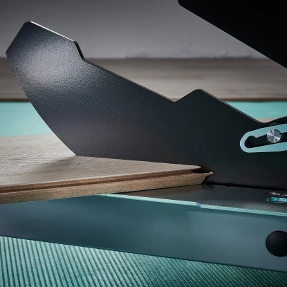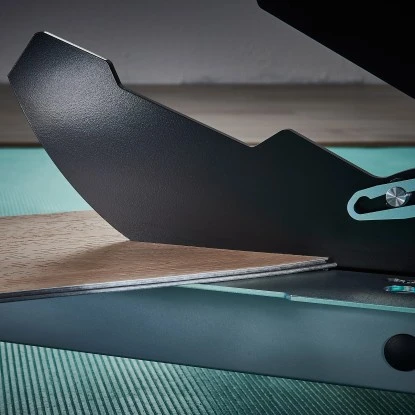 Mit der glatten Klinge schneiden Sie selbst Dielen mit integrierter Trittschalldämmung sauber und splitterfrei, während die Designschicht makellos bleibt. Selbst Klickvinylpaneelen und Vinylfliesen von bis zu 6 mm Stärke bearbeiten Sie mit dem VLC 1000 effektiv, durch die KTL-Beschichtung bleibt nichts an der Klinge haften. Beim Schneidvorgang sorgen die Zahnung der Schneidleisten und der Anschlag für eine sichere Fixierung des Werkstücks, während die rutschhemmenden Fußpuffer für den stabilen Stand des VLC 1000 sorgen. Auf der Materialauflage können Sie Ihre Paneele komfortabel abstützen. Den integrierten 90°-Anschlag können Sie in 4 Stufen um jeweils 40 mm verstellen. So optimieren Sie den Schnittwinkel für kleine Schnittbreiten von 210 bis zu 370 mm.